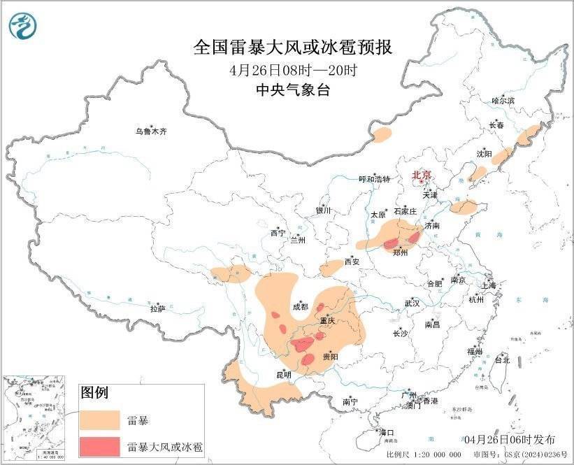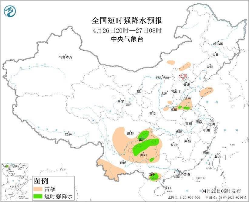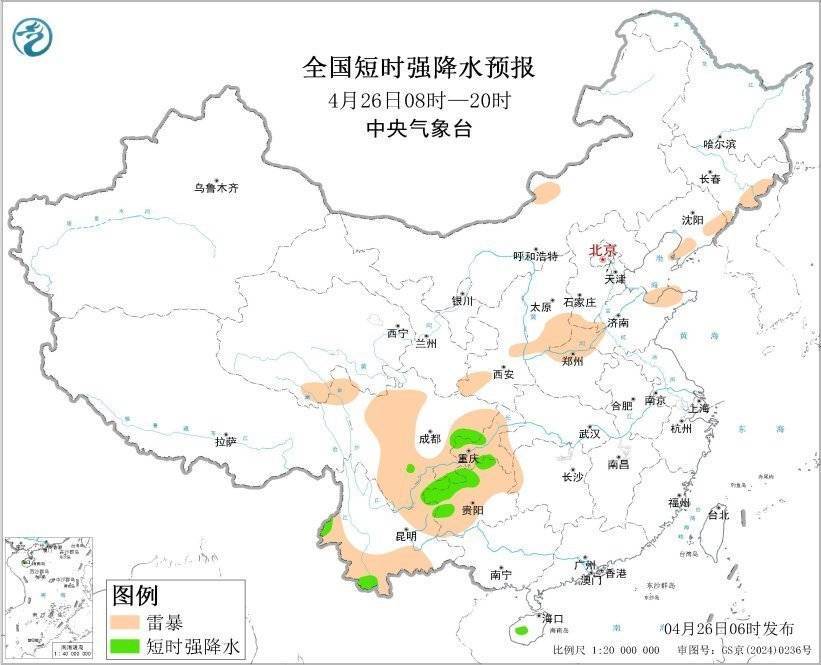 r预计4月26日08时至27日08时,河南东部、湖南西部、四川东部、重庆、贵州西部和北部、云南东北部和西南部、广西南部等地的部分地区将有短时强降水天气,小时雨量20-40毫米,局地可达50毫米以上;另外,山西南部、山东西部、河南北部和西部、四川南部、重庆西部、贵州西部、云南东北部等地的局地将有雷暴大风或冰雹天气。