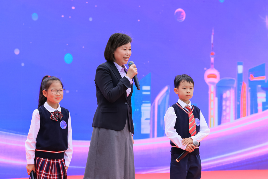 活动现场,福山外国语小学校长钱芳与两名学生代表登台致辞。两名学生代表用中英文流畅分享了一个多月来的探究历程,讲述了自己用科技观察动物、用数据探秘河流、用创意守护山川、用行动保护海洋的实践故事,展现出福娃们爱自然、懂科学、有担当的精神风貌。钱芳校长介绍,本次外语节是一场沉浸式探究盛宴,文化周期间各校区还将开展主题作品展、英语嘉年华、情景演绎、辩论赛等系列活动,全面展示学生探究成果。她同时寄语全体学生保持探索热情,用知识与科技守护家园,以少年担当为构建人类命运共同体贡献力量,并向指导和支持活动的师长、各界人士致以衷心感谢。
