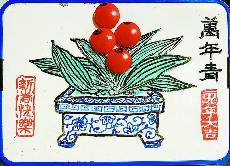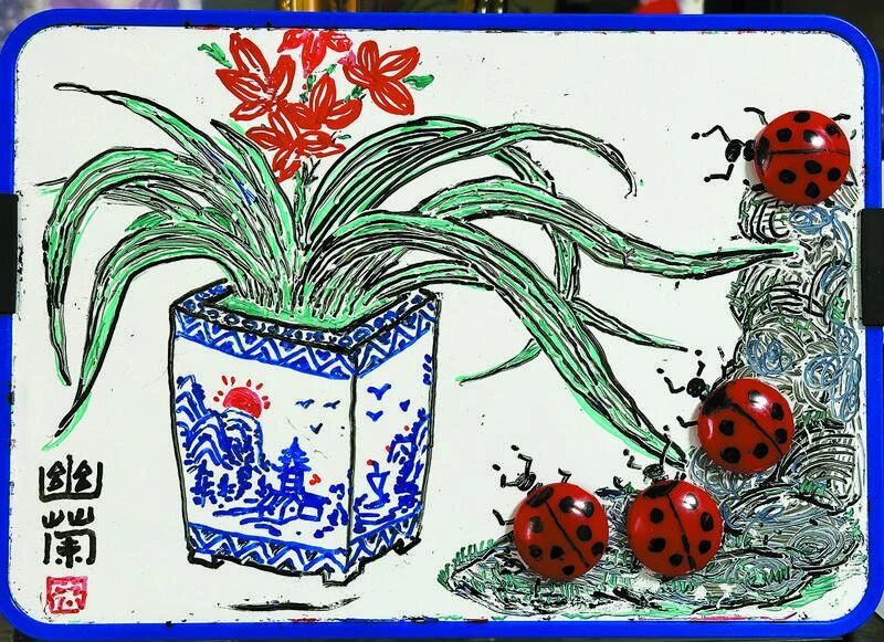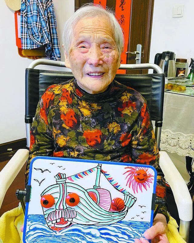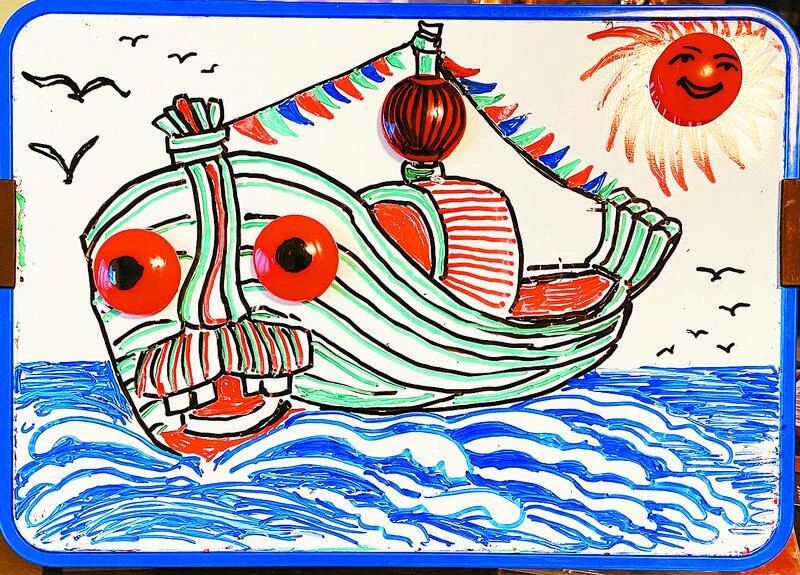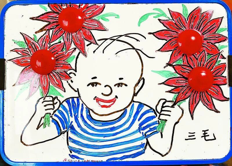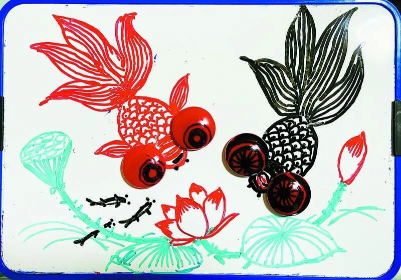 写字板本是孩童嬉戏之物,也许厂家也不会想到,竟有一位七十岁的儿子,会用它为一百岁的母亲画了这么多画。四颗红色圆形磁石,被灵活地用作画作的“点睛之笔”:画金鱼时成为“水泡眼”;画三毛时变成手中的红灯笼;画寿桃时,起初是盘中的寿桃,后又幻化为青花瓷缸上的装饰;画渔船时,则成了渔船欢快的“大眼睛”。在赵丽宏为母亲画的最后一幅画中,它们又变成了两个飞在空中的天使的脸庞。