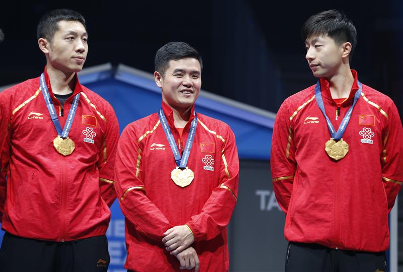 2018年瑞典哈尔姆斯塔德世乒赛夺冠后,许昕(左)、马龙(右)和教练刘国正合影